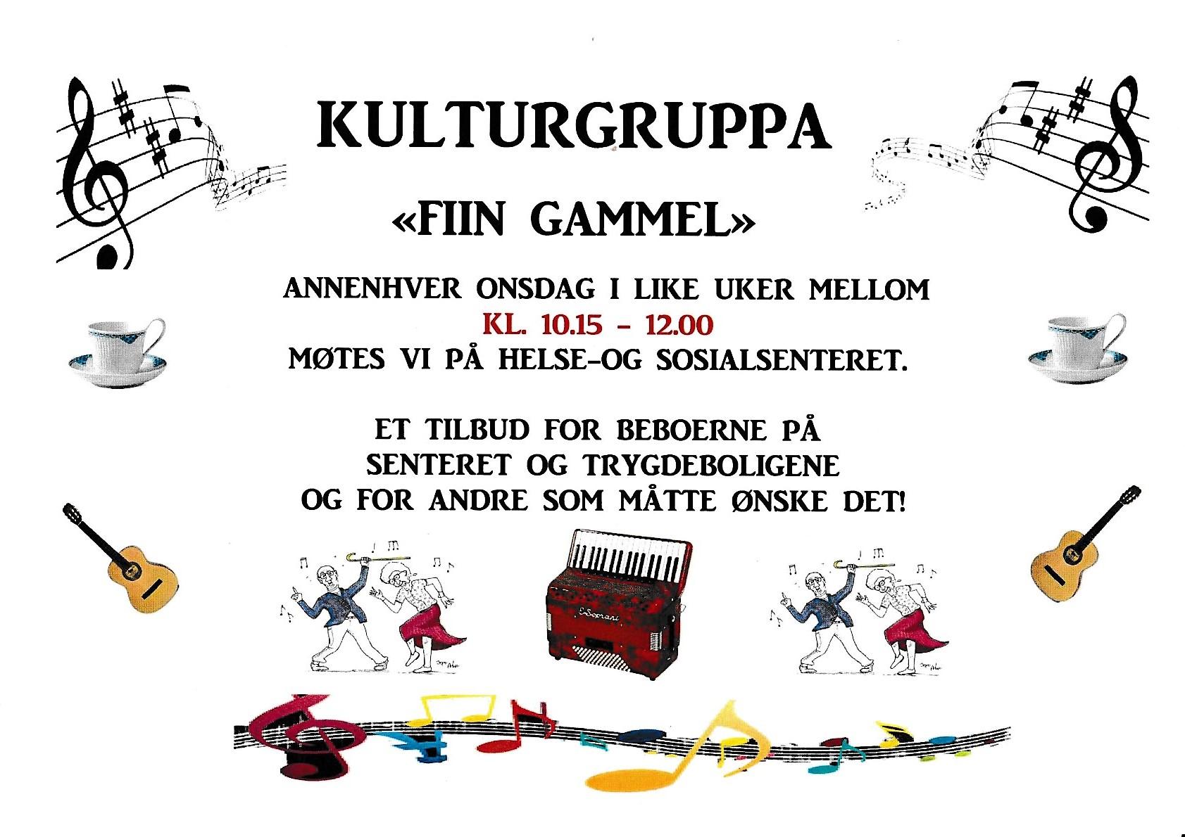 Kulturgruppa "Fiin gammal" Musikk/sang/dans/teater Annenhver onsdag i like uker mellom kl.10.15 - 12.15 møtes vi på Helse- og sosialsenteret. Har du lyst å bidra, så ta kontakt med Grethe Roos på telefon 900 63 755. Vi har som målsetning og bidra med et tilbud som skal være en oppkvikker i hverdagen for beboere på senteret og i trygdeboligene. Musikk, sang og dans